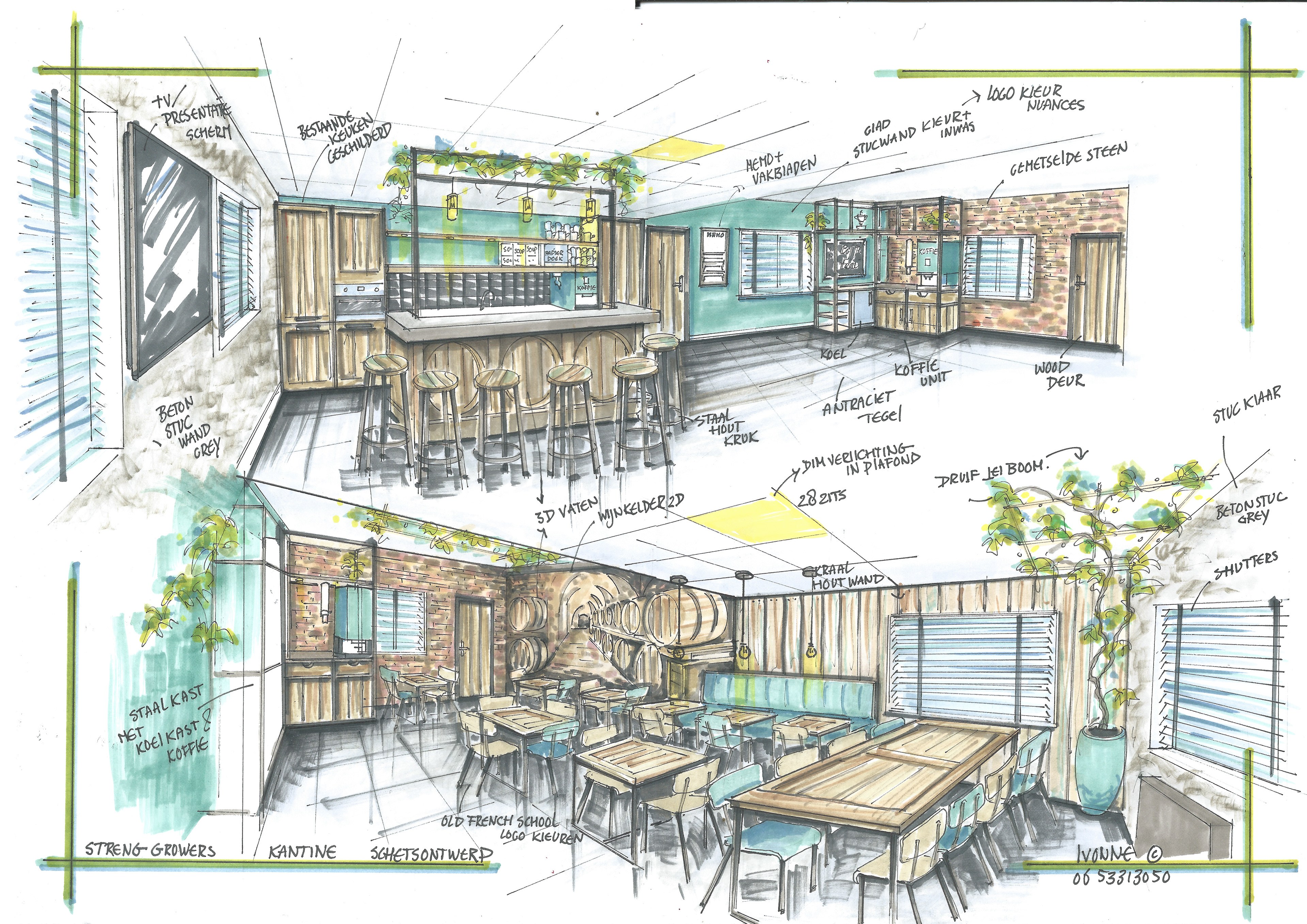 Voor streng hebben wij een nieuwe bedrijfskantine en kantooromgeving ontworpen waarin hun geschiedenis en hun expertise, o.a. het kweken van fruitbomen voor wijnproductie, op de voorgrond staat.